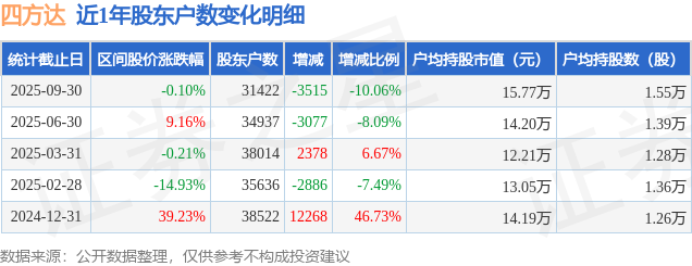 从股价来看,2025年6月30日至2025年9月30日,四方达区间跌幅为0.1%,在此期间股东户数减少3515.0户,减幅为10.06%。