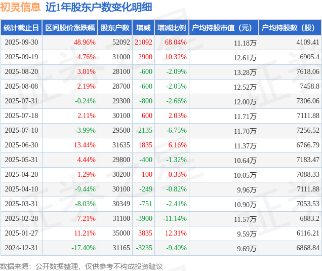 从股价来看,2025年9月19日至2025年9月30日,初灵信息区间涨幅为48.96%,在此期间股东户数增加2.11万户,增幅为68.04%。