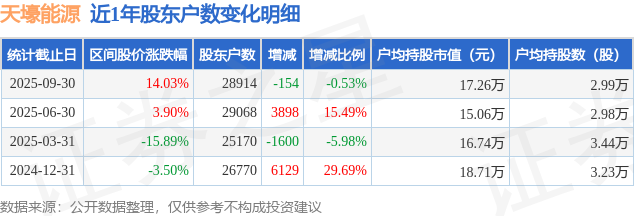 从股价来看,2025年6月30日至2025年9月30日,天壕能源区间涨幅为14.03%,在此期间股东户数减少154.0户,减幅为0.53%。