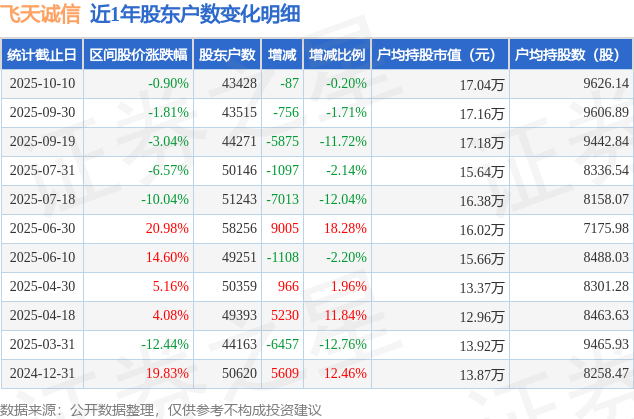 从股价来看,2025年9月30日至2025年10月10日,飞天诚信区间跌幅为0.9%,在此期间股东户数减少87.0户,减幅为0.2%。