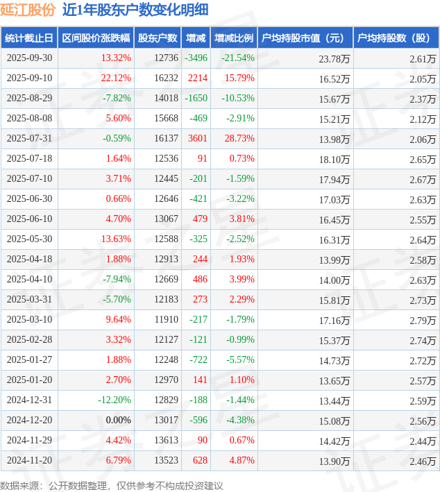 从股价来看,2025年9月10日至2025年9月30日,延江股份区间涨幅为13.32%,在此期间股东户数减少3496.0户,减幅为21.54%。