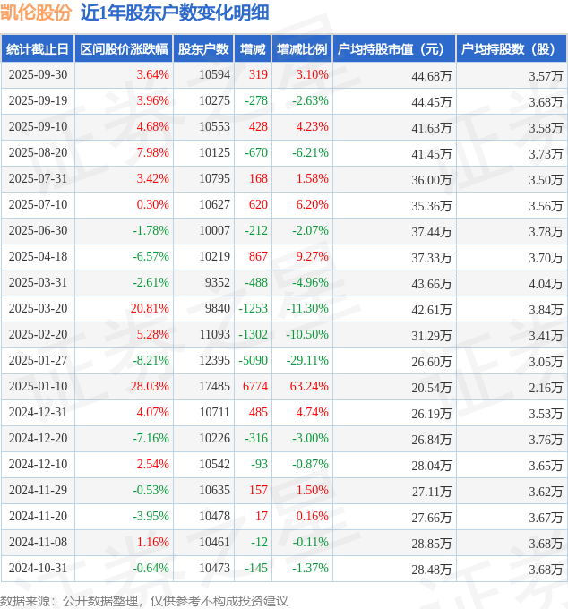 从股价来看,2025年9月19日至2025年9月30日,凯伦股份区间涨幅为3.64%,在此期间股东户数增加319.0户,增幅为3.1%。