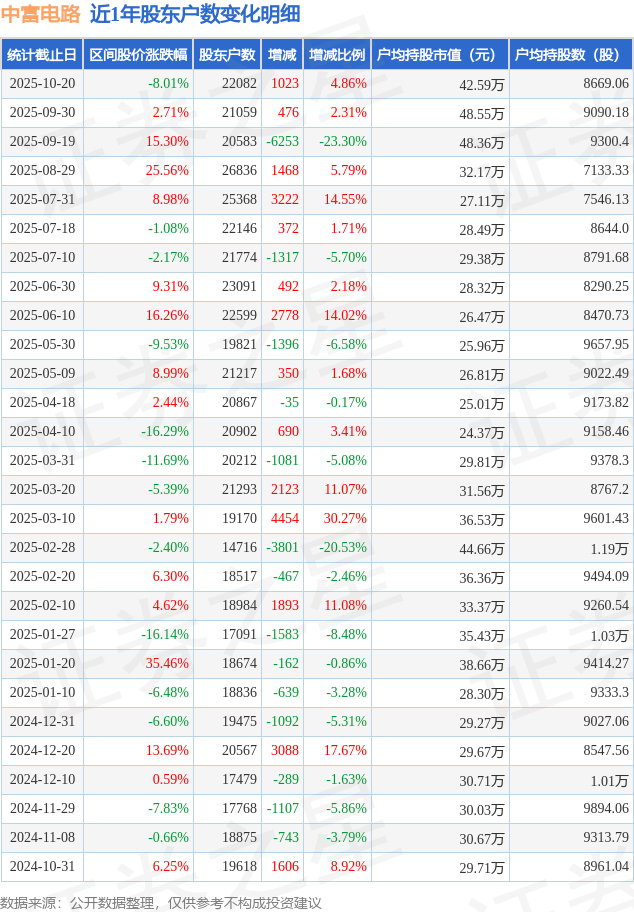 从股价来看,2025年9月30日至2025年10月20日,中富电路区间跌幅为8.01%,在此期间股东户数增加1023.0户,增幅为4.86%。