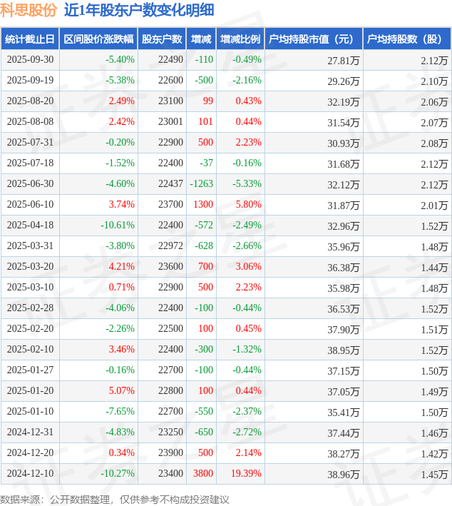 从股价来看,2025年9月19日至2025年9月30日,科思股份区间跌幅为5.4%,在此期间股东户数减少110.0户,减幅为0.49%。