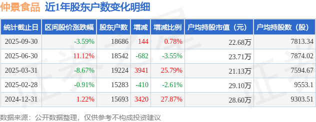 从股价来看,2025年6月30日至2025年9月30日,仲景食品区间跌幅为3.59%,在此期间股东户数增加144.0户,增幅为0.78%。