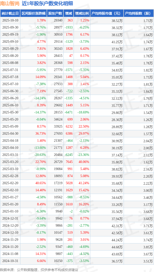 从股价来看,2025年9月30日至2025年10月10日,南山智尚区间涨幅为1.78%,在此期间股东户数增加363.0户,增幅为1.25%。