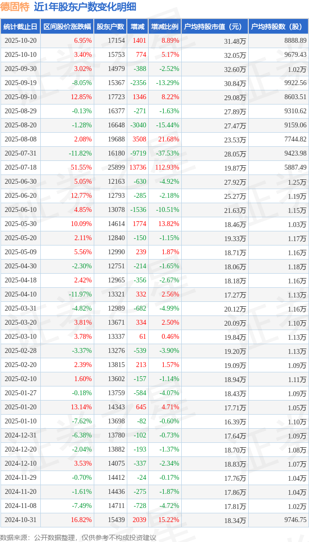 从股价来看,2025年10月10日至2025年10月20日,德固特区间涨幅为6.95%,在此期间股东户数增加1401.0户,增幅为8.89%。