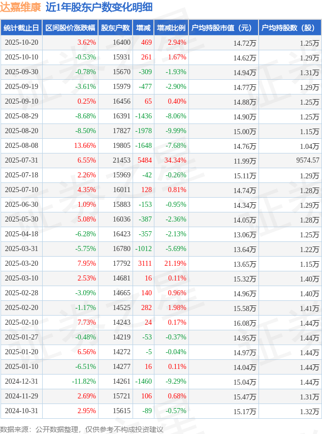 从股价来看,2025年10月10日至2025年10月20日,达嘉维康区间涨幅为3.62%,在此期间股东户数增加469.0户,增幅为2.94%。