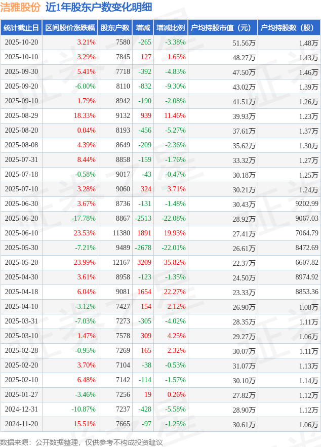 从股价来看,2025年10月10日至2025年10月20日,洁雅股份区间涨幅为3.21%,在此期间股东户数减少265.0户,减幅为3.38%。
