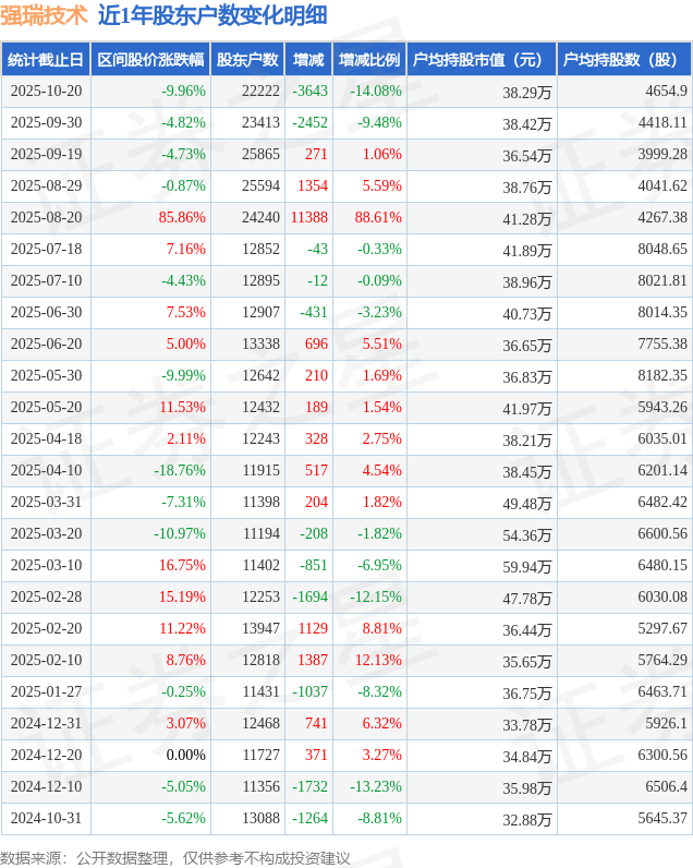从股价来看,2025年9月19日至2025年10月20日,强瑞技术区间跌幅为9.96%,在此期间股东户数减少3643.0户,减幅为14.08%。