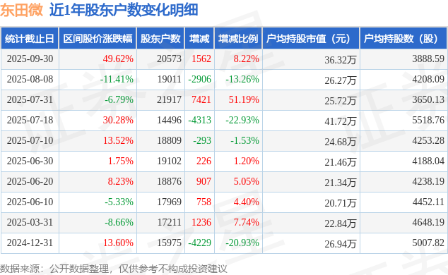 从股价来看,2025年8月8日至2025年9月30日,东田微区间涨幅为49.62%,在此期间股东户数增加1562.0户,增幅为8.22%。