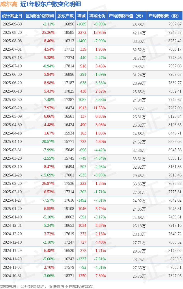从股价来看,2025年8月20日至2025年9月30日,威尔高区间跌幅为2.11%,在此期间股东户数减少1689.0户,减幅为9.09%。