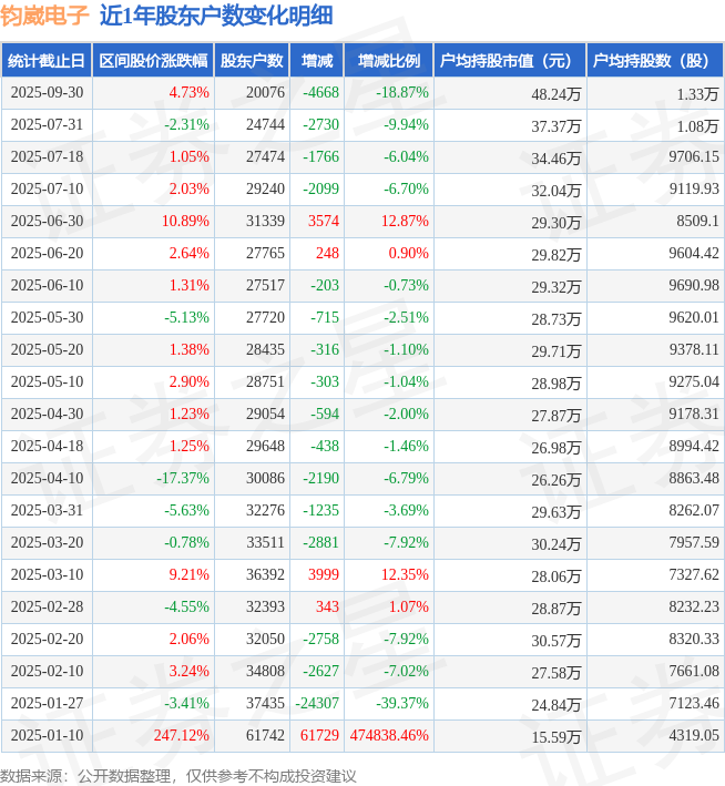 从股价来看,2025年7月31日至2025年9月30日,钧崴电子区间涨幅为4.73%,在此期间股东户数减少4668.0户,减幅为18.87%。