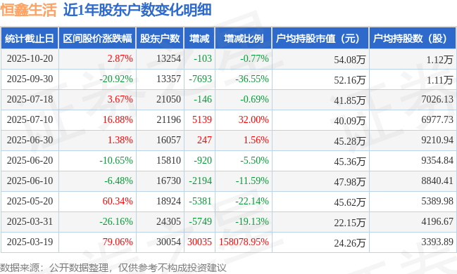从股价来看,2025年9月30日至2025年10月20日,恒鑫生活区间涨幅为2.87%,在此期间股东户数减少103.0户,减幅为0.77%。