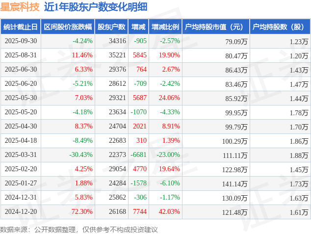 从股价来看,2025年8月31日至2025年9月30日,星宸科技区间跌幅为4.24%,在此期间股东户数减少905.0户,减幅为2.57%。