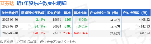 从股价来看,2025年9月19日至2025年9月30日,艾芬达区间跌幅为2.44%,在此期间股东户数减少1263.0户,减幅为6.04%。