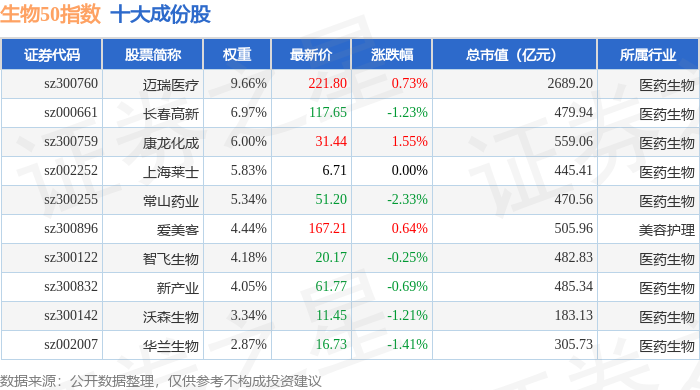 生物50(399280)指数十大成份股详情如下: