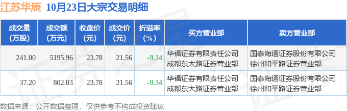 证券之星消息,10月23日江苏华辰发生大宗交易,交易数据如下: