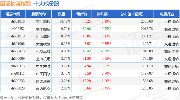 证券之星消息,10月23日,国证物流(399353)指数报收于2167.41点,涨0.44%,成交134.41亿元,换手率0.57%。当日该指数成份股中,上涨的有30家,恒逸石化以5.27%的涨幅领涨,下跌的有9家,小商品城以1.29%的跌幅领跌。