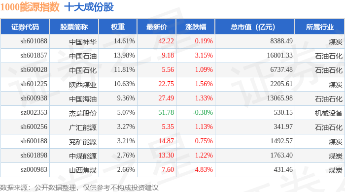 证券之星消息,10月23日,1000能源(399381)指数报收于3032.88点,涨1.3%,成交216.49亿元,换手率0.78%。当日该指数成份股中,上涨的有22家,山西焦煤以4.83%的涨幅领涨,下跌的有4家,石化油服以2.77%的跌幅领跌。