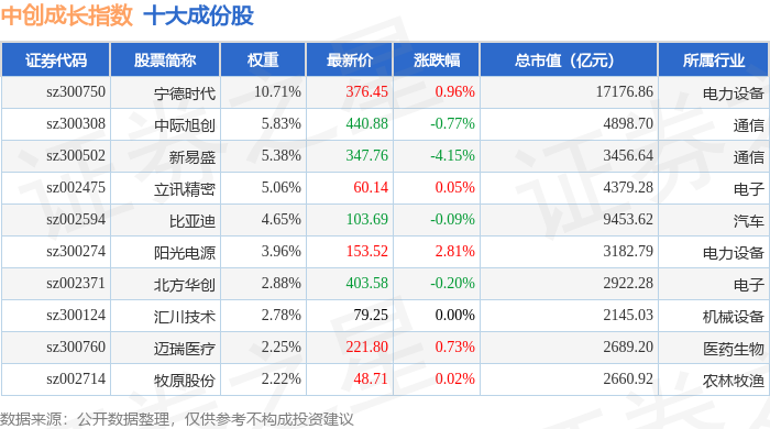 证券之星消息,10月23日,中创成长(399626)指数报收于1966.75点,跌0.22%,成交1911.87亿元,换手率2.5%。当日该指数成份股中,上涨的有84家,盛新锂能以10.03%的涨幅领涨,下跌的有79家,乖宝宠物以14.42%的跌幅领跌。