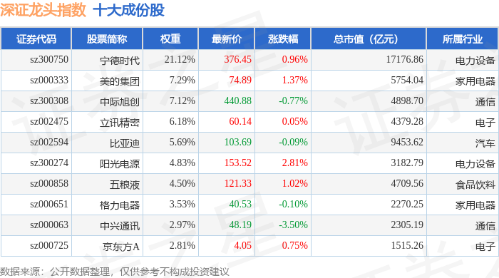 证券之星消息,10月23日,深证龙头(399653)指数报收于3007.36点,涨0.38%,成交889.75亿元,换手率1.06%。当日该指数成份股中,上涨的有33家,深粮控股以9.94%的涨幅领涨,下跌的有17家,中兴通讯以3.5%的跌幅领跌。
