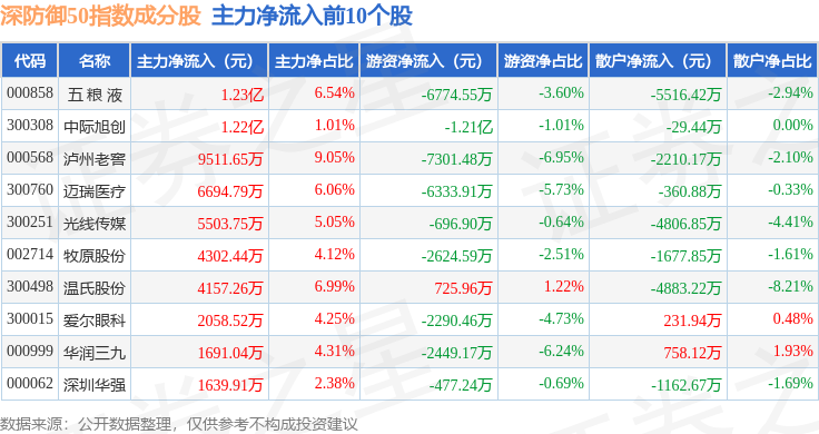 资金流向方面,深防御50(399671)指数成份股当日主力资金净流出合计24.15亿元,游资资金净流入合计4.51亿元,散户资金净流入合计19.63亿元。成份股资金流向详情见下表: