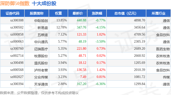 证券之星消息,10月23日,深防御50(399671)指数报收于9478.13点,跌0.93%,成交604.64亿元,换手率1.27%。当日该指数成份股中,上涨的有30家,华测检测以3.03%的涨幅领涨,下跌的有20家,乖宝宠物以14.42%的跌幅领跌。