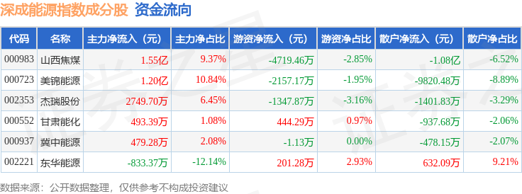 资金流向方面,深成能源(399680)指数成份股当日主力资金净流入合计3.04亿元,游资资金净流出合计7580.08万元,散户资金净流出合计2.28亿元。成份股资金流向详情见下表: