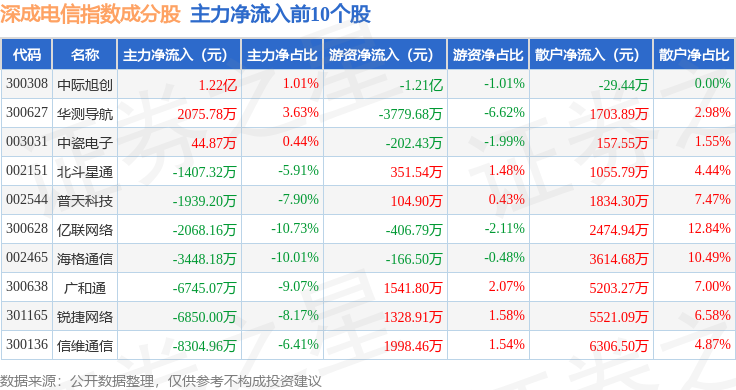 资金流向方面,深成电信(399688)指数成份股当日主力资金净流出合计24.52亿元,游资资金净流入合计8.81亿元,散户资金净流入合计15.71亿元。成份股资金流向详情见下表: