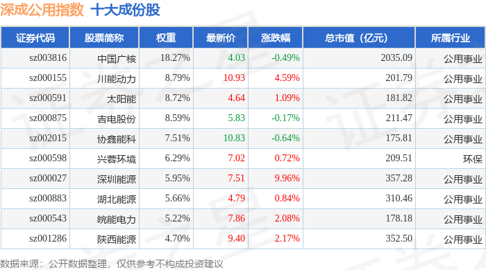 证券之星消息,10月23日,深成公用(399689)指数报收于875.16点,涨1.53%,成交49.86亿元,换手率0.87%。当日该指数成份股中,上涨的有12家,深圳能源以9.96%的涨幅领涨,下跌的有4家,协鑫能科以0.64%的跌幅领跌。