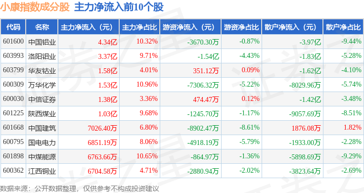 资金流向方面,小康指数(399901)成份股当日主力资金净流出合计11.07亿元,游资资金净流出合计1.92亿元,散户资金净流入合计12.99亿元。成份股资金流向详情见下表: