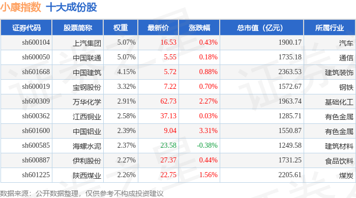 小康指数(399901)十大成份股详情如下: