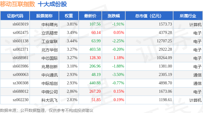 证券之星消息,10月23日,移动互联(399970)指数报收于4410.5点,跌0.23%,成交1465.84亿元,换手率1.75%。当日该指数成份股中,上涨的有57家,神州信息以10.04%的涨幅领涨,下跌的有41家,生益科技以4.87%的跌幅领跌。
