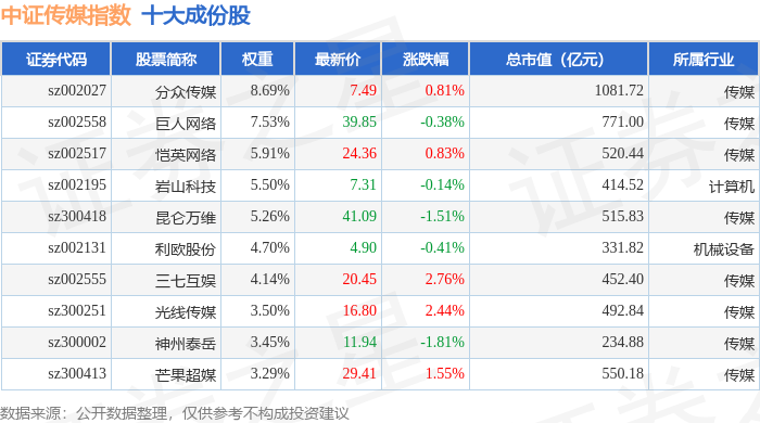 中证传媒(399971)指数十大成份股详情如下: