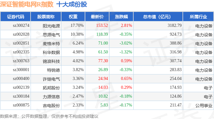 证券之星消息,10月23日,深证智能电网R(470054)指数报收于3989.48点,跌0.06%,成交243.04亿元,换手率2.75%。当日该指数成份股中,上涨的有20家,华明装备以3.65%的涨幅领涨,下跌的有29家,华自科技以7.23%的跌幅领跌。
