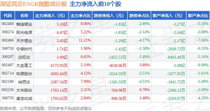 资金流向方面,深证民企ESGR(470056)指数成份股当日主力资金净流出合计14.75亿元,游资资金净流出合计1.02亿元,散户资金净流入合计15.77亿元。成份股资金流向详情见下表: