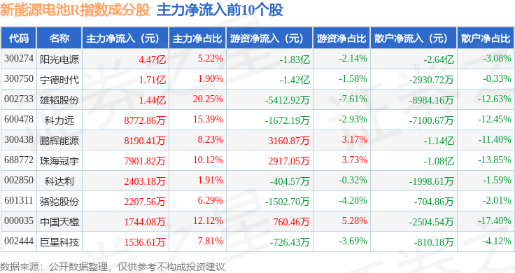 资金流向方面,新能源电池R(480027)指数成份股当日主力资金净流出合计5868.59万元,游资资金净流出合计2.75亿元,散户资金净流入合计3.34亿元。成份股资金流向详情见下表: