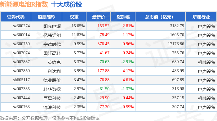 证券之星消息,10月23日,新能源电池R(480027)指数报收于3496.8点,涨0.84%,成交430.91亿元,换手率1.98%。当日该指数成份股中,上涨的有31家,雄韬股份以9.99%的涨幅领涨,下跌的有19家,华自科技以7.23%的跌幅领跌。