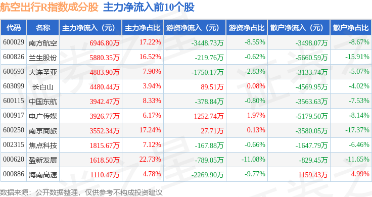 资金流向方面,航空出行R(480059)指数成份股当日主力资金净流出合计3.28亿元,游资资金净流出合计9922.31万元,散户资金净流入合计4.27亿元。成份股资金流向详情见下表:
