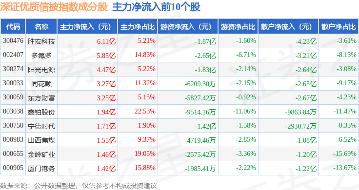 资金流向方面,深证优质信披(970065)指数成份股当日主力资金净流出合计80.89亿元,游资资金净流出合计773.37万元,散户资金净流入合计80.97亿元。成份股资金流向详情见下表: