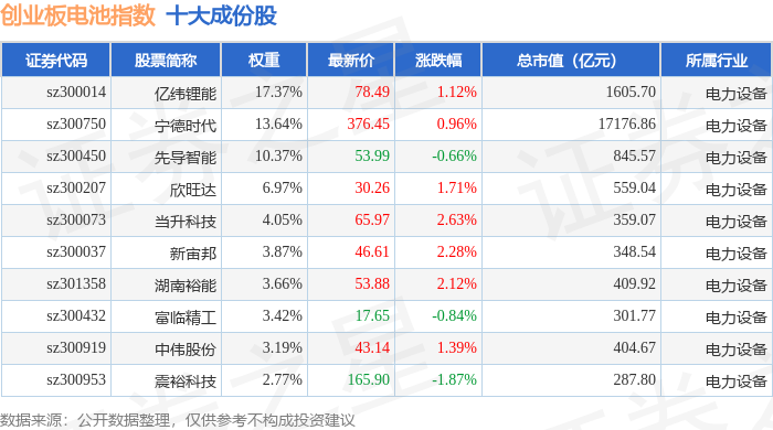 创业板电池(970081)指数十大成份股详情如下: