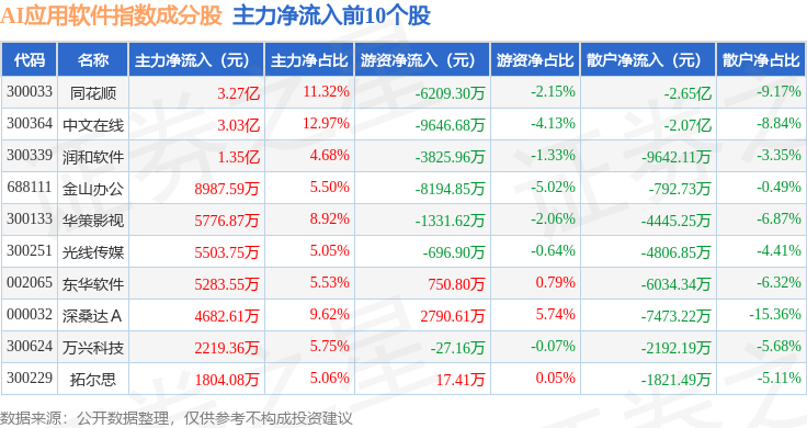 资金流向方面,AI应用软件(980107)指数成份股当日主力资金净流入合计2115.76万元,游资资金净流入合计6847.86万元,散户资金净流出合计8963.61万元。成份股资金流向详情见下表: