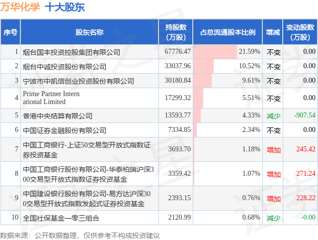 证券之星消息,10月23日万华化学发布公告《万华化学:万华化学集团股份有限公司简式权益变动报告书》,其股东PRIME PARTNER INTERNATIONAL LIMITED于2025年8月22日至2025年10月22日间合计减持1646.96万股,占公司目前总股本的0.5261%,变动期间该股股价下跌6.49%,截止10月22日收盘报61.34元。