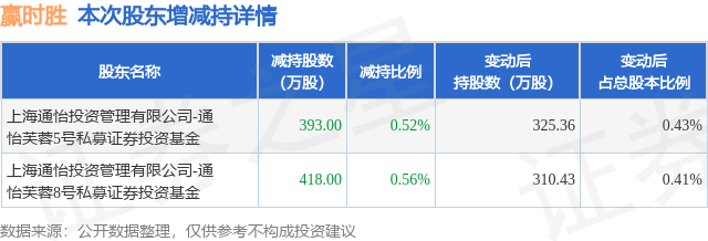 证券之星消息,10月23日赢时胜发布公告《赢时胜:关于持股5%以上股东及一致行动人权益变动触及1%整数倍的公告》,其股东上海通怡投资管理有限公司-通怡芙蓉5号私募证券投资基金、上海通怡投资管理有限公司-通怡芙蓉8号私募证券投资基金于2025年9月11日至2025年10月22日间合计减持811.0万股,占公司目前总股本的1.0799%,变动期间该股股价下跌13.15%,截止10月22日收盘报20.14元。