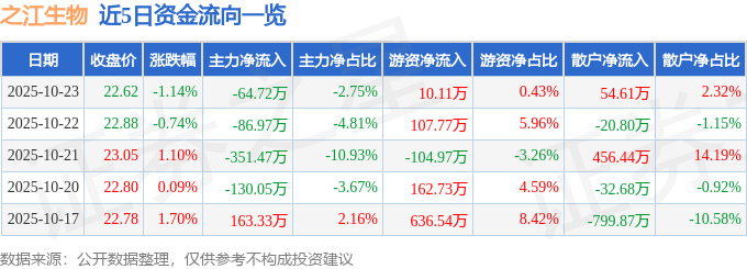 证券之星消息,截至2025年10月23日收盘,之江生物(688317)报收于22.62元,下跌1.14%,换手率0.54%,成交量1.04万手,成交额2356.97万元。
