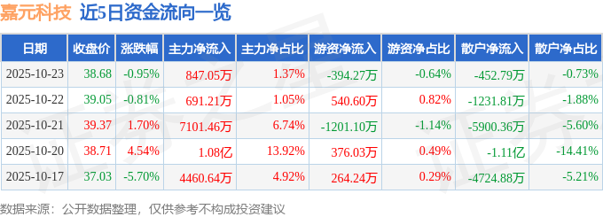 10月23日的资金流向数据方面,主力资金净流入847.05万元,占总成交额1.37%,游资资金净流出394.27万元,占总成交额0.64%,散户资金净流出452.79万元,占总成交额0.73%。