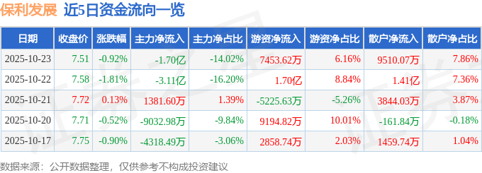 证券之星消息,截至2025年10月23日收盘,保利发展(600048)报收于7.51元,下跌0.92%,换手率1.35%,成交量161.39万手,成交额12.1亿元。