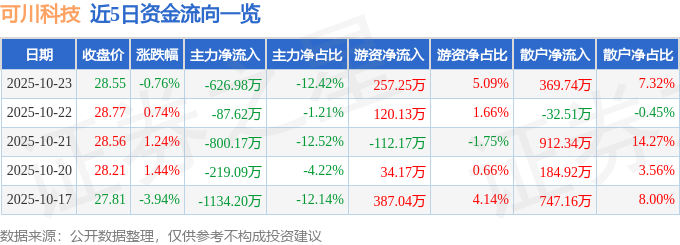 10月23日的资金流向数据方面,主力资金净流出626.98万元,占总成交额12.42%,游资资金净流入257.25万元,占总成交额5.09%,散户资金净流入369.74万元,占总成交额7.32%。