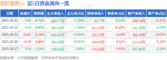 证券之星消息,截至2025年10月23日收盘,亚虹医药(688176)报收于9.86元,下跌0.7%,换手率1.44%,成交量6.26万手,成交额6123.67万元。